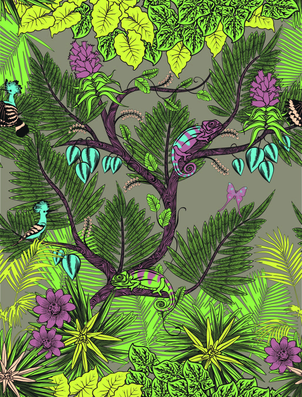A vibrant collection of seamless repeat patterns inspired by nature, featuring botanical motifs, tropical landscapes, and playful wildlife.